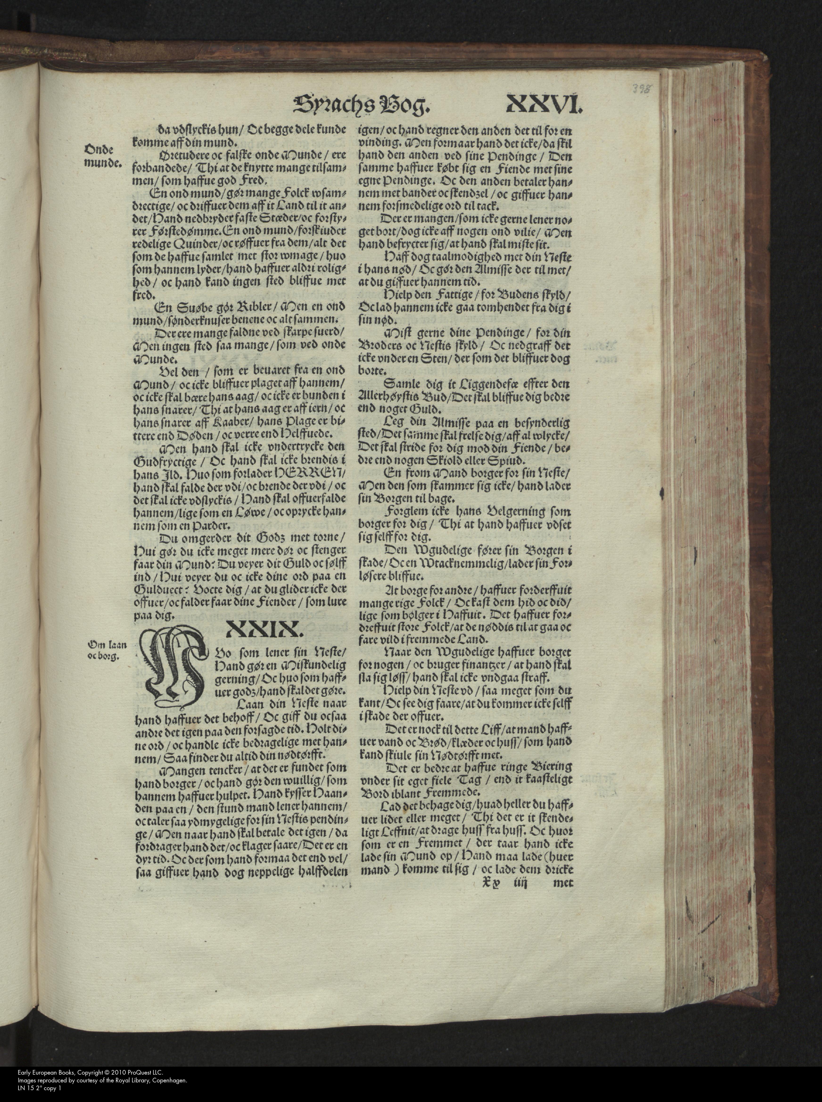 En ond mund / gør mange Folck wsamdrectige / oc driffuer dem aff it Land til it andet / Hand nedbryder faste Stæder / oc forstyrer Førstedømme. En ond mund / forskiuder redelige Quinder / oc røffuer fra dem / alt det som de haffue samlet met stor wmage / huo som hannem lyder / hand haffuer aldri rolighed / oc hand kand ingen sted bliffue met fred.